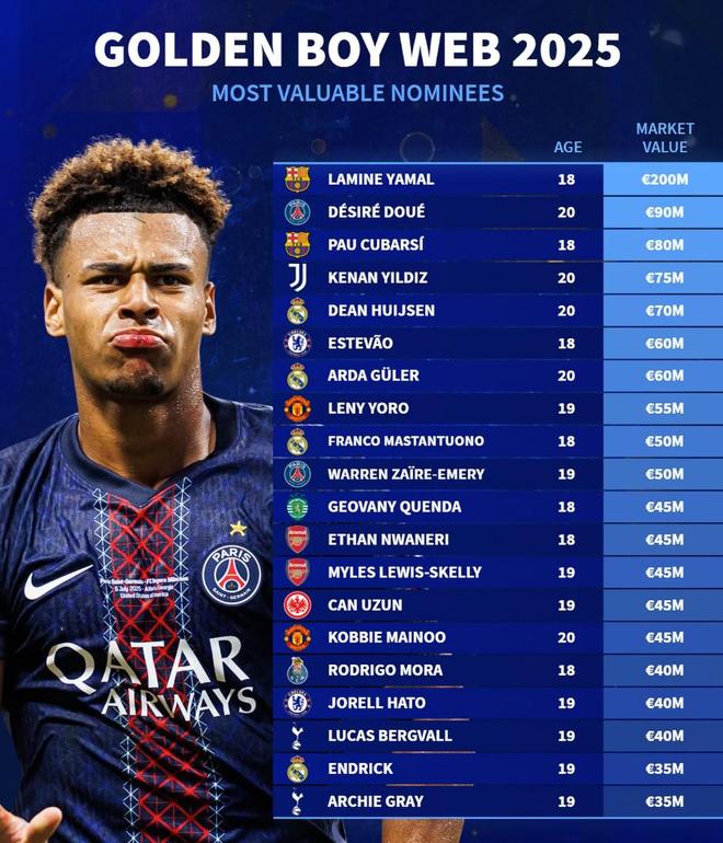 德转统计2025金童奖候选身价榜:亚马尔、杜埃、库巴西前三